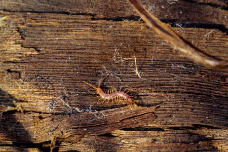Close-up of a Common Stonecreeper, Lithobius forficatus on wood.