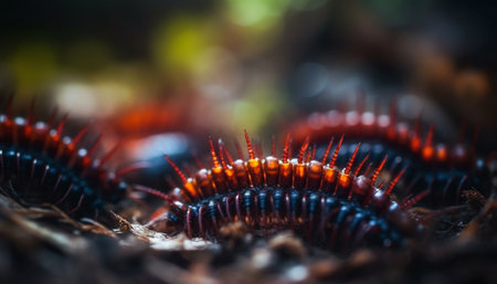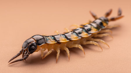 This close-up image captures the intricate details of a venomous centipede, highlighting its vibrant colors and unique body structure. Ideal for nature and science enthusiasts.