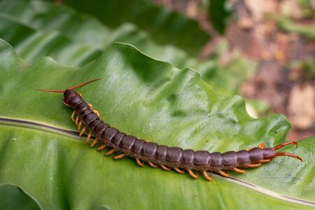 A centipede is on leaves. It is invertebrate. It is poisonous animals and have many legs.