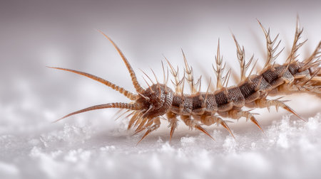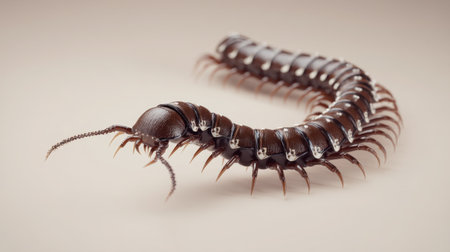 This macro photograph captures the intricate details of a brown millipede, showcasing its segmented body and antennae. Ideal for nature studies.