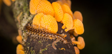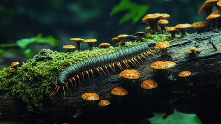 A vibrant centipede crawls on a moss-covered log surrounded by tiny orange mushrooms, capturing the fascinating beauty and complexity of forest ecosystems.