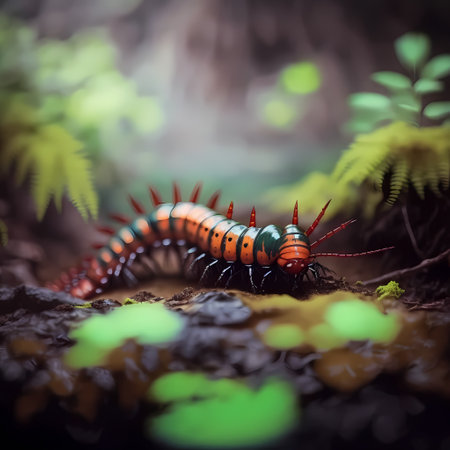 A vibrant millipede moves gracefully over moist ground amidst colorful leaves, showcasing the stunning details of nature in a lush forest environment with gentle bokeh effects.
