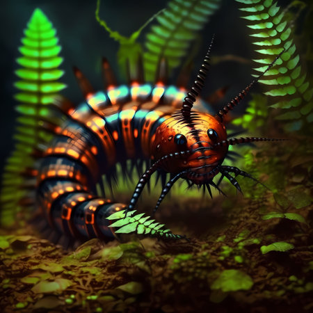 A poisonous centipede crawls in a row on wet leaves generated by artificial intelligence