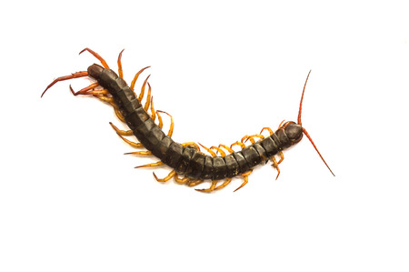 Giant centipede, Ethmostigmus rubripes, walking isolated on a white background