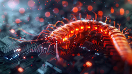 Big cyber worm eats computer microchip. Viruses on PC. AI generative.