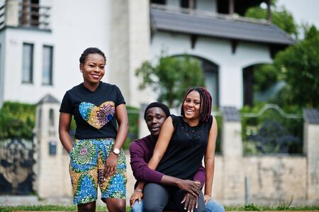 Group of three stylish trendy afro france friends posed at autumn day. Black african man model with two dark skinned womans.