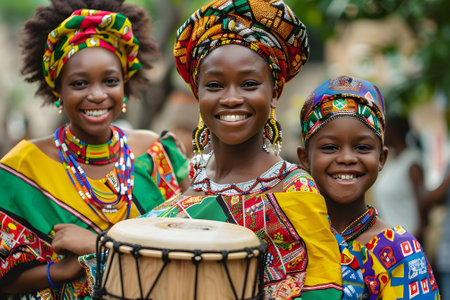 Group of young African American people wearing traditional clothing in desert, all smiling