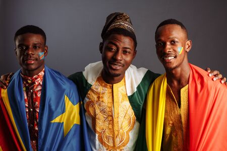 Concept of friendship between African countries: 3 American men in national clothes from different countries stay hug together with flags of Democratic Republic Congo, Republic of the Congo, Nigeria