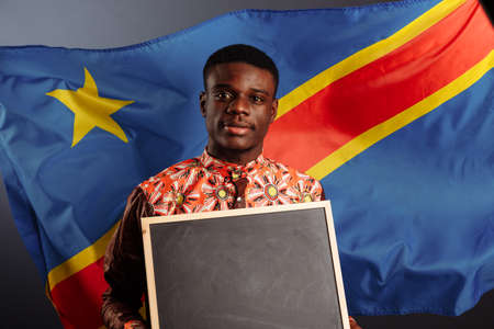 Young man in gold national clothes smiling into the camera and posing with Congo Flag isolated in gray Background.