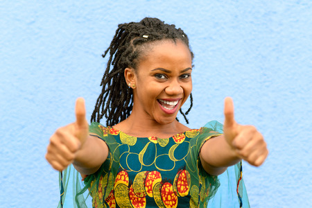 Enthusiastic motivated african young woman giving a thumbs up gesture of approval and success with a beaming smile