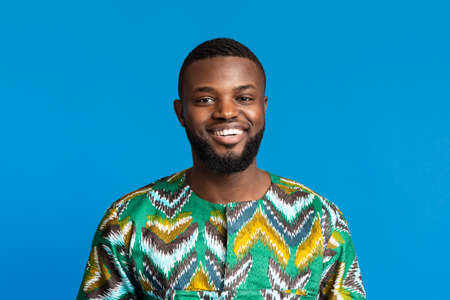 Portrait of handsome cheerful african guy in traditional african clothes over blue studio background. Young black man smiling at camera, studio shot, copy space. Africa, traditions and culture concept