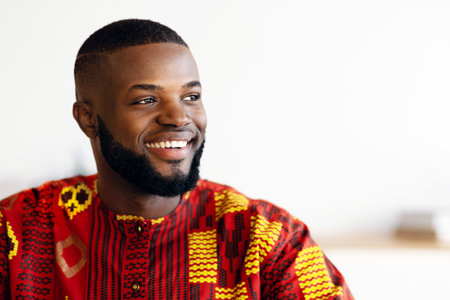 Portrait of young adult Black man smiling and looking at camera wearing patterned hat and traditional beaded necklace celebrating Kwanzaa against plain background