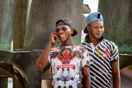 OUIDAH, BENIN - Jan 10, 2017: Unidentified Beninese young boys in colored shirts and caps smile at the voodoo festival, which is anually celebrated on January, 10th.