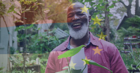 Holding potted plant, senior man wearing rose shirt standing in backyard garden, with plant shelves. Botanical, horticulture, outdoor, natural, tranquility, growth, wellness
