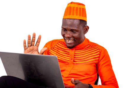 Portrait of a black young man wearing african traditional red colorful clothes.