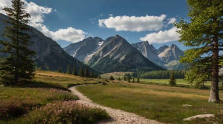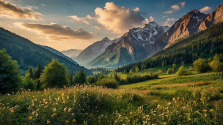 Panoramic view of beautiful alpine meadows and mountains in summer