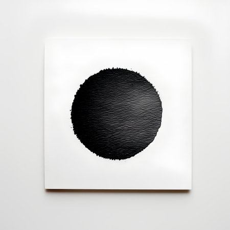 A distinctive black circle stands alone, casting a subtle shadow on a textured, muted background, embodying minimalist art principles.