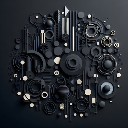 This abstract design features a variety of black and gold circular shapes arranged artistically, showing different textures and finishes, creating a visually striking composition for modern aesthetics