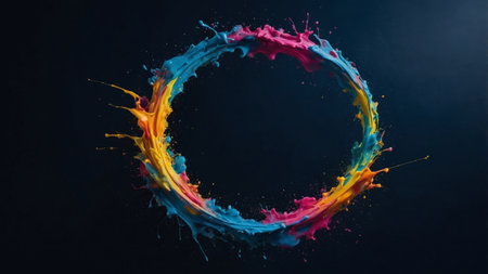 A brilliant display of color emerges as splashes of blue, pink, and orange create a striking circular shape, contrasting beautifully with the deep darkness surrounding it.
