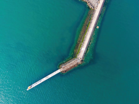 Aerial view of jetty with concrete blocks, white jetty against blue water