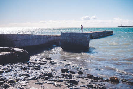 Silhouette of man standing alone on old pier looking at sunlit sea on bright sunny day. Feeling of loneliness, sadness