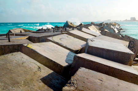 Breakwater made of concrete slabs on the Caribbean Sea. Cancun.