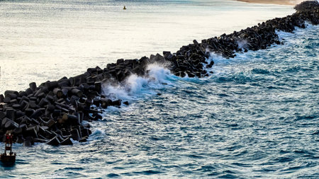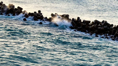Coast breakwaters protecting from large waves with sea water background. The seashore is reinforced with concrete tetrapods.