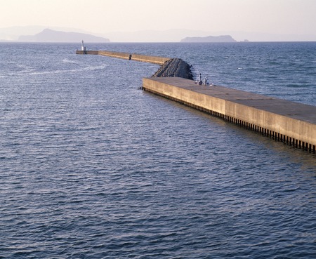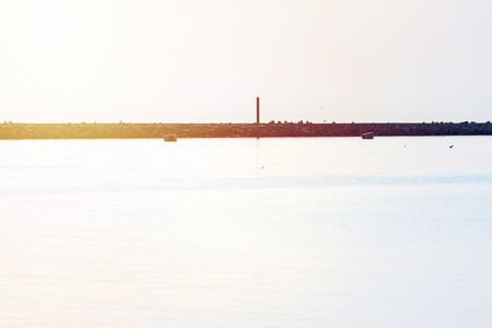 Jetty with towers and buoys. Beautiful seascape, copy space. Breakwater for protect ships at shipyard from waves