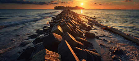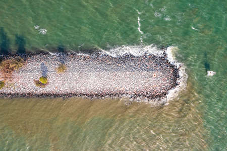 Aerial drone view of a stone breakwater or jetty in Baltic sea, Baltiysk, Kaliningrad, Russia at sunset. top view