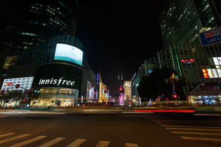 SHANGHAI, CHINA - FEBRUARY 13, 2018: Neon signs lit on Nanjing Road. The area is the main shopping district of Shanghai and one of the world's busiest shopping streets.