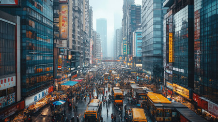A vibrant urban landscape filled with crowds and yellow vehicles under rainy skies, capturing the essence of city life amid towering skyscrapers and lively market activity.