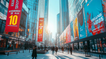 As the sun sets, bustling pedestrians roam a lively urban area adorned with vibrant advertisements and tall skyscrapers, creating a dynamic atmosphere that captures the energy of city life.