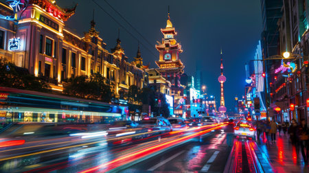 This image presents a stunning night-time cityscape bathed in neon lights, with reflections on streets creating a futuristic atmosphere. Resplendent.