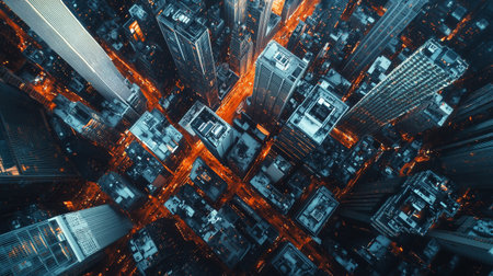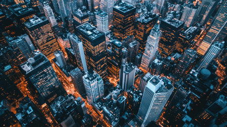 Aerial view of modern skyscrapers in a bustling cityscape at dusk with glowing lights