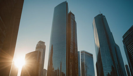An aerial view of a bustling cityscape with towering skyscrapers reaching for the sky