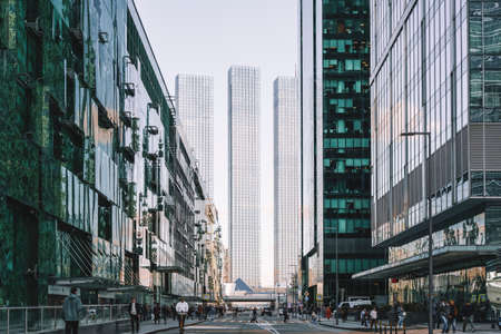Moscow, Russia - May 30, 2022: Streets of business district Moscow City. Modern architecture and infrastructure of a prestigious urban area.