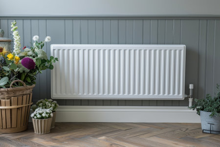 Close-up of a white metal radiator on a light wall, minimalist interior with clean lines and soft lighting, symbolizing warmth and modern home design