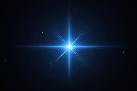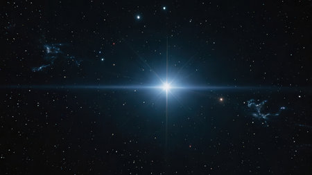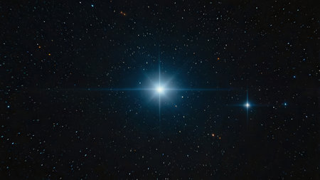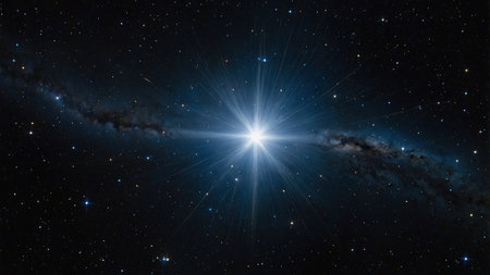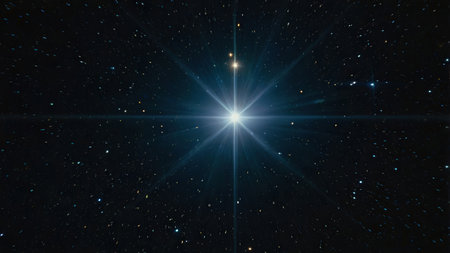 Bright star shining in night sky, surrounded by twinkling stars, creating stunning celestial display. vibrant light radiates with starburst effect, captivating viewers