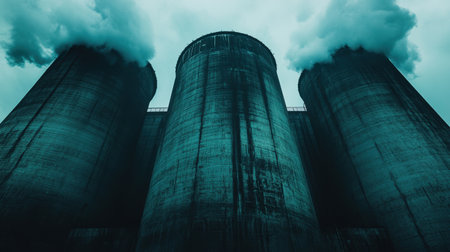 A dramatic view of industrial cooling towers releasing steam into a dark and cloudy sky, highlighting the intersection of energy production and environmental concerns.