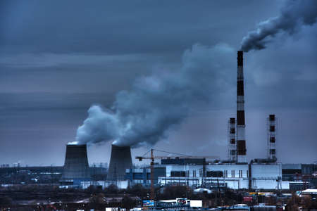 Industrial cityscape of Kyiv, Ukraine. Steam from cooling tower of a coal power plant and smoke from chimneys. Sunset. Sun shining through clouds, smog in the distance