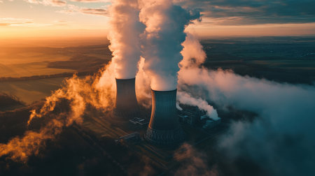 This stunning aerial image captures a nuclear power plant at sunset, showcasing its cooling towers releasing steam into the atmosphere. The serene landscape surrounding the facility highlights the balance between energy production and environmental considerations