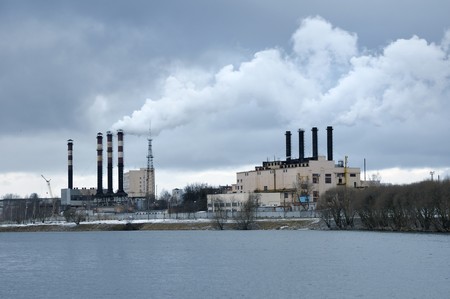 heavy smoke comes out from industrial plant pipes over river waters