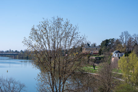 View of the Pompejanum and the Breakfast Temple in Aschaffenburg, Bavaria, Germany, with the River Main, a bridge, and a blue sky
