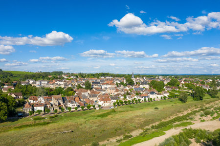 Aerial view of Pouilly sur Loire with its traditional houses, church spire, and lush greenery bordered by a sandy riverbank. The scene is bright and tranquil with scattered clouds and vivid summer light.