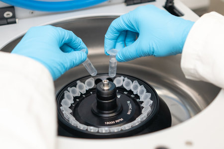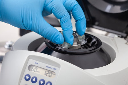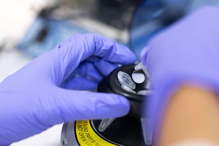 Gloved hand places specimen tube into centrifuge for medical research and analysis use