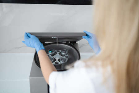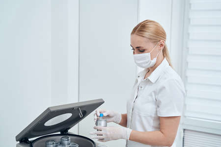 Cosmetologist puts metal container with test tubes in a centrifuge
