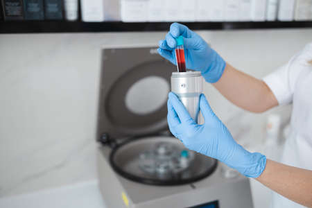 Beautician doctors hands put test tube with blood in centrifuge container. Rejuvenation plasmolifting procedure.