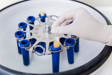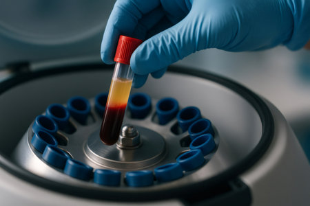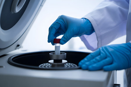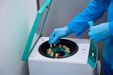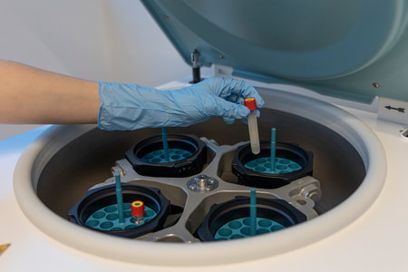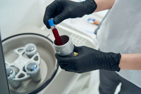 Gloved hand carefully placing a blood sample tube into a centrifuge, initiating the process for plasma separation and analysis in a lab setting