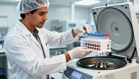 Man loads a rack of blood test tubes into a clinical centrifuge while wearing labcoat, gloves and hairnet in a diagnostic laboratory, illustrating sample preparation, centrifugation and equipment operation for testing workflows