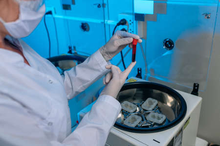 Doctor puts test tube of blood to centrifuge machine in medical clinic, analysis for coronavirus.